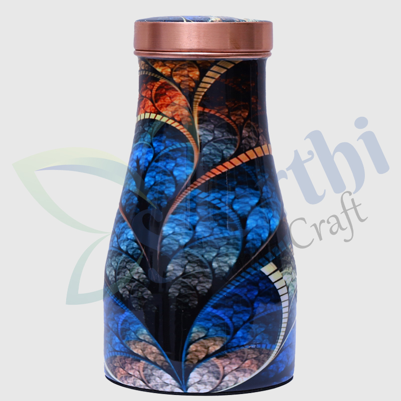 900ML in Capacity and 350gms in weight (approx)Joint Less Meena (Enamel) Print Multi Design Pure Copper Water Bedside Pot with Copper Lid which can be use a Glass also for drinking water purpose.