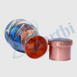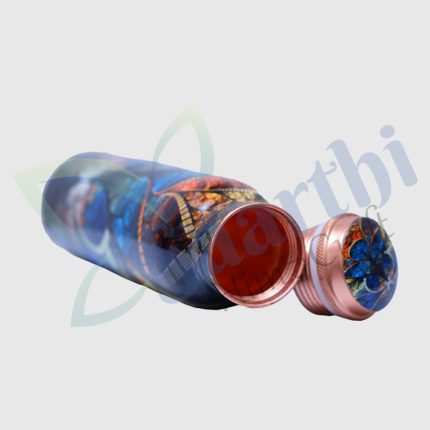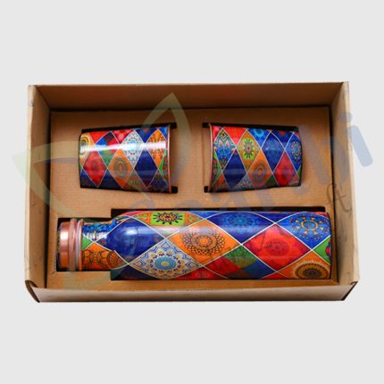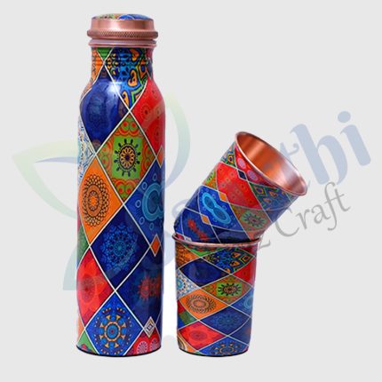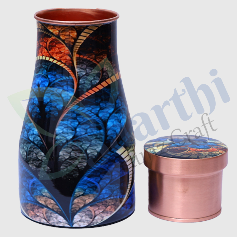900ML in Capacity and 350gms in weight (approx)Joint Less Meena (Enamel) Print Multi Design Pure Copper Water Bedside Pot with Copper Lid which can be use a Glass also for drinking water purpose.