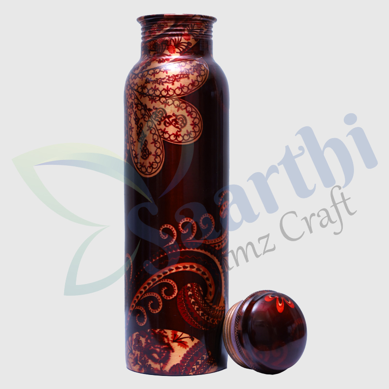 950ML in Capacity and 280gms in weight (approx)Joint Less Black Floral Heat Printed Design Pure Copper Water Bottle and Silicon Washer for leak proof.
