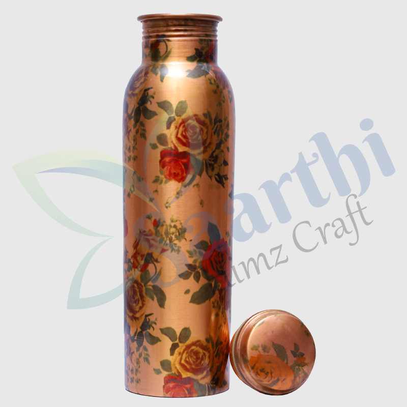 950ML in Capacity and 280gms in weight (approx)Joint Less Golden Floral Heat Printed Design Pure Copper Water Bottle and Silicon Washer for leak proof.