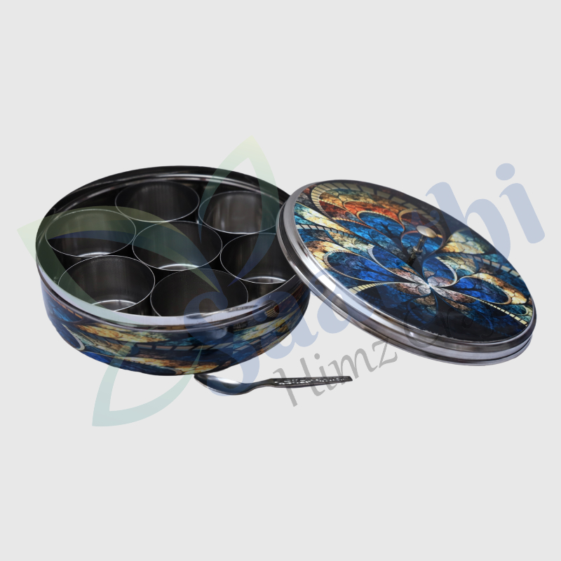 A Designer Masala Box having Steel Base with Meena Print Multi Design on Lid & Box with Black Velvet At Bottom making it Skid Free. It Contains Masala Box with Seven Containers inside with and a Spoon.